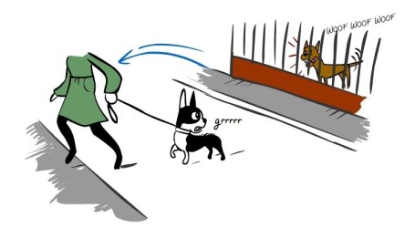 7. Barking dog behind a fenced yard (FIGHT) We pass this house almost every morning. Sometimes the dog is there in the yard running around and barking. I immediately crossed the street, calling “Boogie!” in a happy voice but Boogie’s head was still turned towards the dog, teeth bared. When we finally crossed the street and he looked at me, “Click!” and treat. Then suddenly, WHOA! There was another dog and owner right there in front of us! (oh shit)