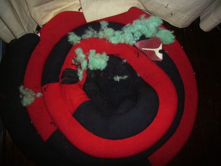 Well, it wasn’t all Boogie’s fault. I learned that this Bella Creature Comforts bed has actually been discontinued. They don’t make it anymore and it’s no wonder why. The fabric covering is quite soft and flimsy, and the photo above shows the sad and sorry results after much “fluffing” . And of course, when Boogie saw the fluff coming out, he got excited and the bed became a big fun plush toy. He had green fluff hanging from his flews tonight.