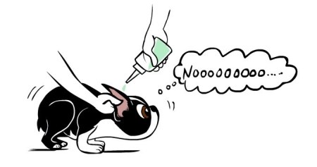 Boogie absolutely hates having his ears cleaned. Whenever he sees me with the ear wash bottle in my hand (or even a neosporin tube or anything that looks like “medication”), he runs off to hide underneath the coffee table or in his crate.