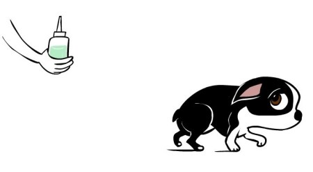 My first mistake was to expect too much too soon. I held the bottle in my hand and gave Boogie treats for coming near me. Then I held out the bottle in front of Boogie’s nose with treats in my other hand. Boogie took one sniff of the bottle and backed right off. “Uh oh. I know what that shit is.”