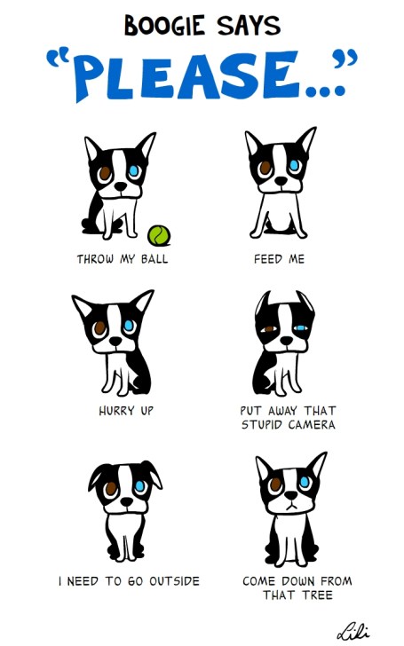 NILIF is something that almost all dog owners already know about. It is sort of a “relationship philosophy” for humans and dogs that is often said to prevent and/or fix behavioral issues. With NILIF, the dog has to earn his food, attention, permission to get on the couch, anything… by first performing a specified polite behavior, usually sitting. Coincidentally, I recently finished doing some illustrations for Sophia Yin’s “Learn To Earn” program so the NILIF regimen is still fresh in my mind even though, thankfully Boogie is already mostly a calm, polite and patient dog so I don’t feel any need to micromanage his behaviors.