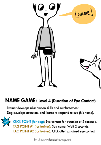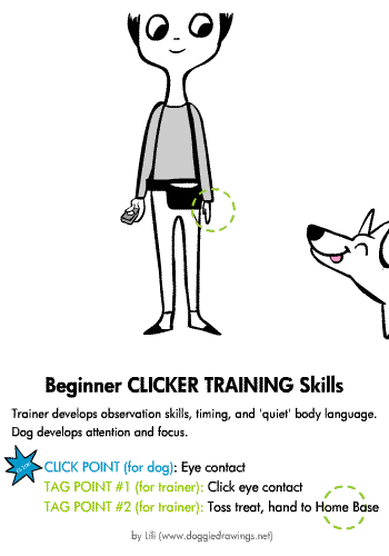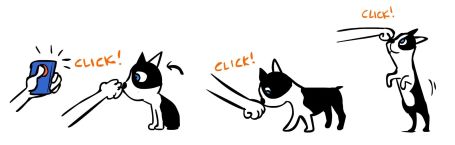 *Similar clicker lessons can already be found via dog training blogs/sites, YouTube videos and books, so I have decided to do something different and present these as animated drawings. Note: these are my own interpretations of the Cyberdog Online lessons. The animations are not part of the course.