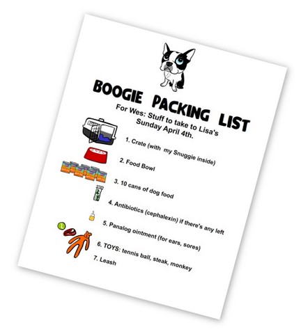 While I am away, Boogie will stay with Wes for a few days, and then with Lisa for one week.