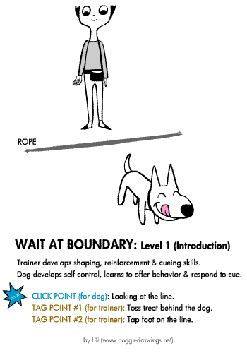 In Level 2 of the BOUNDARY lesson (my homework for this week), my new Tag Point is to stop tapping the line and click when Boogie slows down/shows hesitation before he approaches the line. Eventually a verbal cue (eg, “Wait”) will be added. I am hoping that this cue when learned, will have Boogie waiting politely when someone comes to the door….