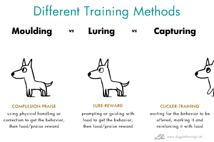 A long time ago, I trained Boogie to Sit, Down, Stay, Shake Hands etc. using the Moulding and Luring methods. I remember pushing Boogie’s butt down to the floor to teach him to sit, and when this didn’t work, I successfully lured him into a sitting position by moving a tennis ball over his head. (He wasn’t a very food-motivated dog when I first adopted him). As his head followed the ball – “Sit!” – his butt plopped down on the floor and he was rewarded.